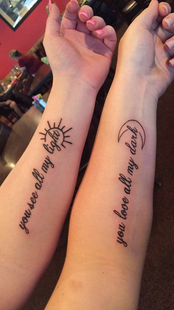 SCRIPT BEST FRIEND TATTOOS There is nothing more sentimental BFF tattoo idea than a script handwriting tattoo amongst all Maybe you babes have already made your decisions on what means a lot to you or prepare to get inspired by these deep meaning script tattoos that you can blend with your own best friend relationship style If you want to make your BFF tattoo even more special and unique. The best kinds of friends are those that have been with you through the good times and the bad Celebrate the best friend that’s been with you through your growing up stages with something symbolic like a butterfly tattoo or two #59 My heart beats for you Here’s a little twist to the usual heart design tattoos. Matching crescent, sun and star temporary tattoos, perfect for best friends and siblings Set of three plus three Size 12 in / 3 cm (width) This temporary tattoos are ·Safe & nontoxic ·FDAcompliant and fun for all ages Small Tattoos last on average 25 days.